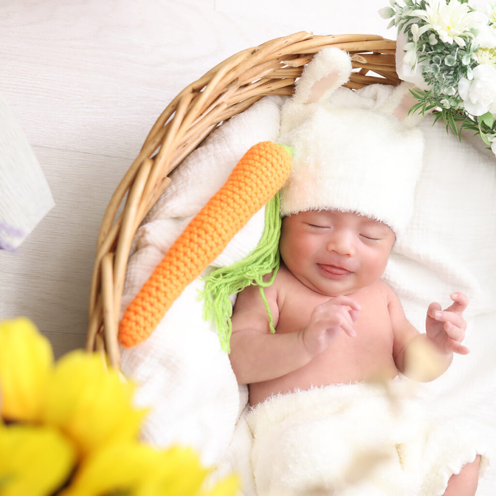 自然光とライティングを組み合わせたやわらかな撮影で、赤ちゃんの自然な表情を大切にしています。